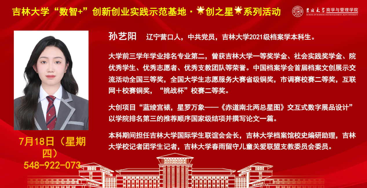、吉林大学“数智+”创新创业实践示范基地共同举办。此次活动旨在激发学生的创新精神,培养学生的创业能力。活动邀请到吉林大学国家级“大学生创新创业训练计划”项目“蓝绫宫裱,星罗万象——《赤道南北两总星图》交互式数字展品设计”和“觉醒年代穿越游戏设计——多重叙事视角下《新青年》红色档案创意开发”的主要成员,围绕大学生创新创业实践经验和执行过程进行介绍,吸引了来自档案学、大数据管理与应用等专业本科生60余人次。