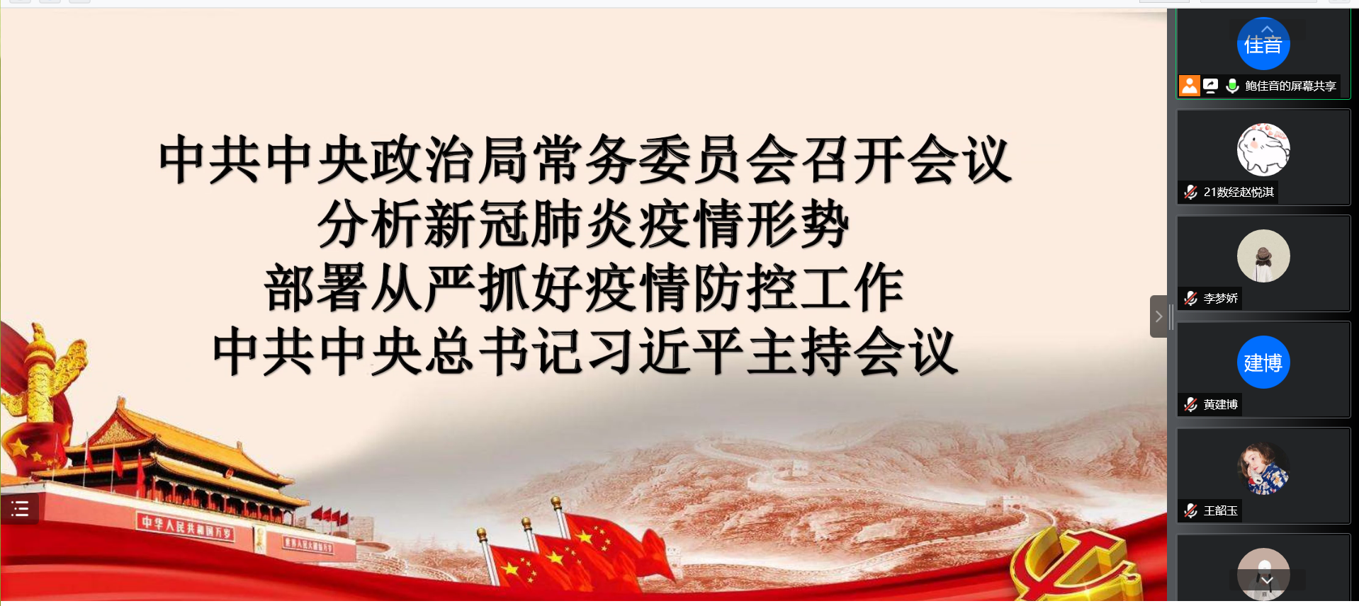 硕士研究生第一党支部支部书记鲍佳音主持、宣传委员王韶玉记录。此次党日活动主要学习“中共中央政治局常务委员会召开会议,分析新冠肺炎疫情形势,部署从严抓好疫情防控工作,中共中央总书记习近平主持会议”的会议精神和会议内容。习近平指出,常态化疫情防控以来,我们坚持“外防输入、内防反弹”,不断提升分区分级差异化精准防控水平,快速有效处置局部地区聚集性疫情,最大限度保护了人民生命安全和身体健康,我国经济发展和疫情防控保持全球领先地位,充分体现了我国防控疫情的坚实实力和强大能力,充分彰显了中国共产党领导和我国社会主义制度的显著优势。会议要求,各地区各部门各方面要把思想和行动统一到党中央决策部署上来,党政同责,齐抓共管,做到守土有责、守土尽责,提高防疫本领。要加强组织领导,克服麻痹思想、厌战情绪、侥幸心理、松劲心态,以时不我待的精神抓实抓细疫情防控各项工作。疫情较为严重的地方,党政主要领导和各级领导干部要把防疫工作放在第一位,尽锐出战,决战决胜。各级党组织和广大党员、干部要积极发挥作用,深入防控一线,深入群众,积极帮助群众排忧解难。要强化督查问责,对失职失责导致疫情失控的要立即依纪依规查处,严肃问责。